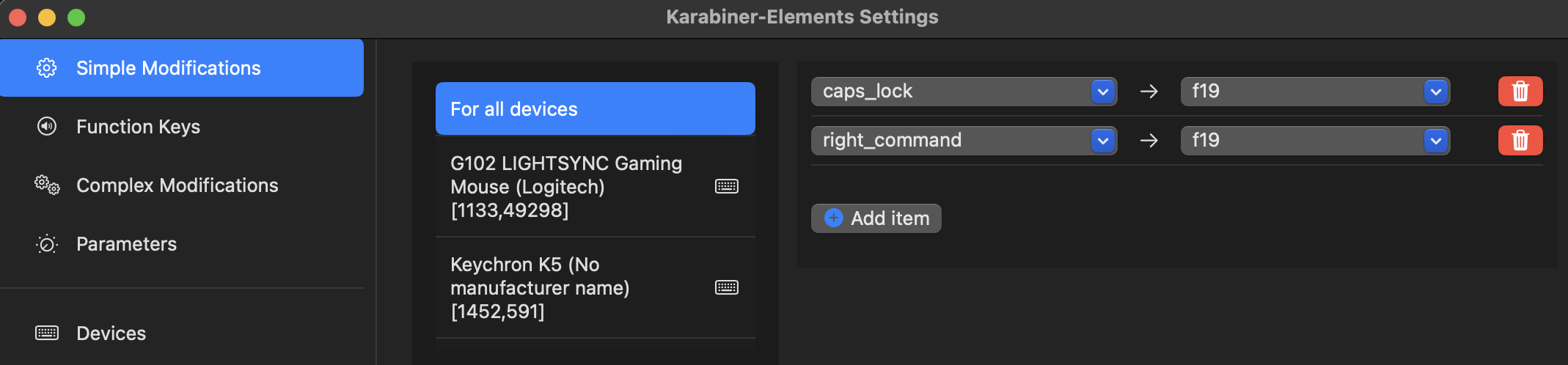 - Modifier keys에서 caps_lock을 고른다. Function keys에서 f19를 고른다.