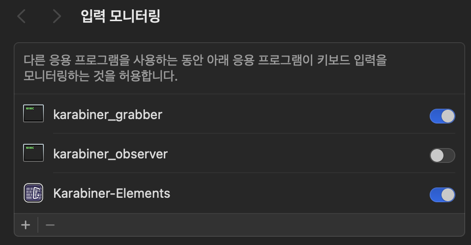 아래 사진과 같이 Karabiner grabber와 Elements를 허용으로 설정해준다.