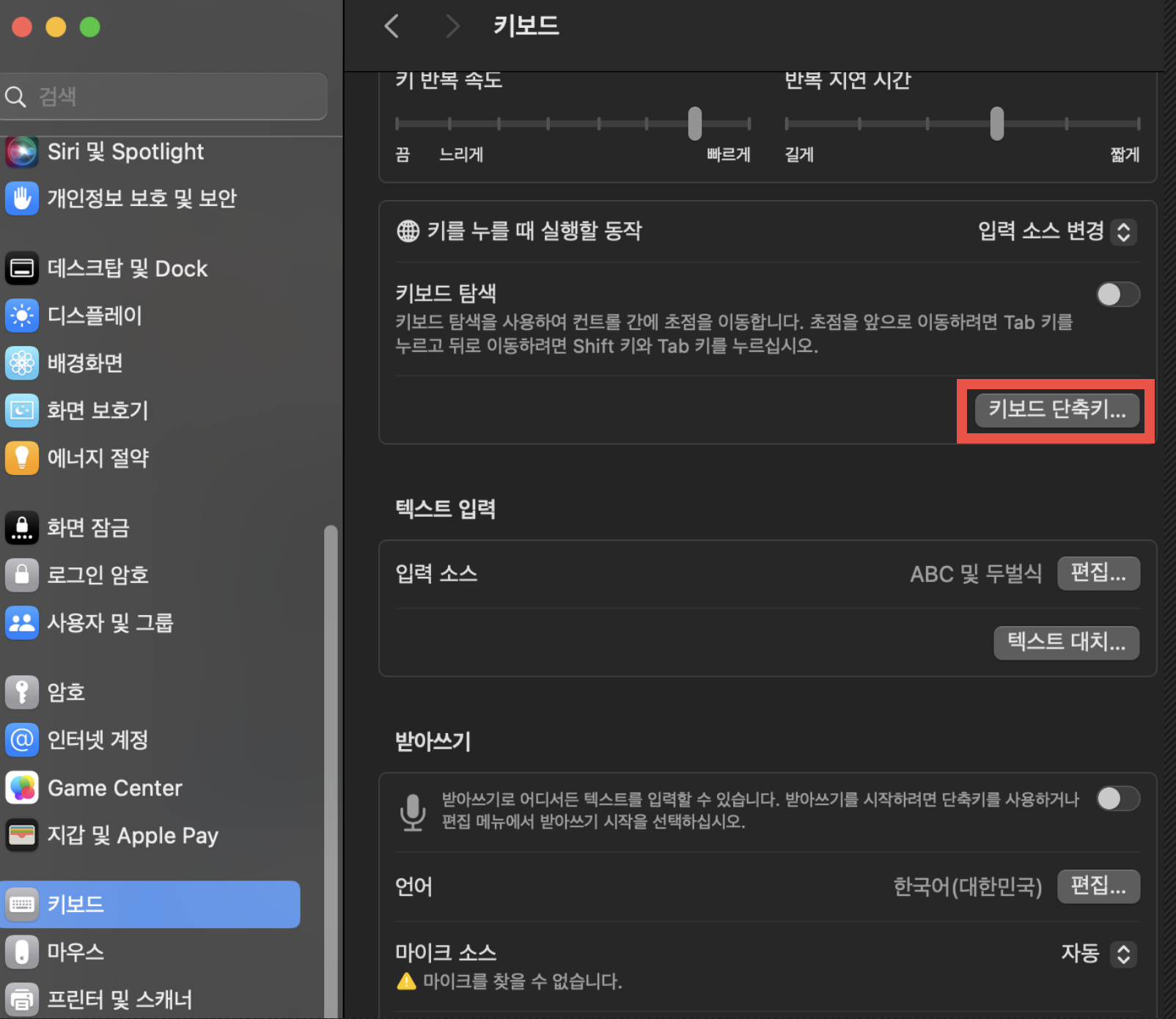 이제다시 '설정' -> '키보드' -> '키보드 단축키' 로 이동.
