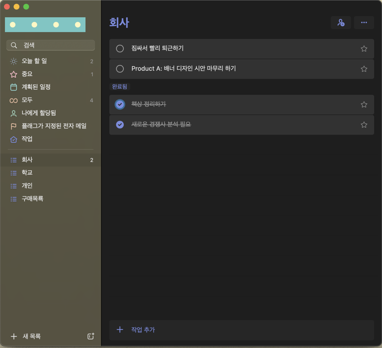 완료한 업무의 경우에는 클릭 한번으로 아래 그림과 같이 완료됨으로 보낼 수 있다. 꿀!